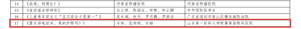 为持续推动健康知识普及,不断满足人民群众日益增长的健康知识需求,国家卫生健康委与国家中医药局、国家疾控局、全国总工会、中国科协共同举办了“健康知识普及行动—2025年新时代健康科普作品征集活动”。征集活动共征集各地各部门推荐的47950件作品,经形式审查、省级推荐、专家终审,最终有352件作品入选“健康知识普及行动—2025年新时代健康科普作品征集活动优秀作品”。其中,山东第一医科大学附属青岛眼科医院科普短视频入选辟谣类优秀作品。