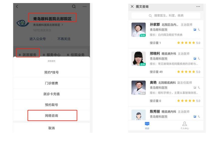 微信搜索关注“青岛眼科医院”或“青岛眼科医院北部院区”公众号,点击左下角“就诊服务”-“网络咨询”,进入在线咨询页面,各科室每日均安排有医师提供免费咨询服务。