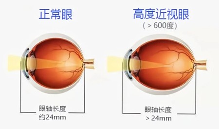 正常情况下,人的眼球类似球体,但随着近视加深,眼轴变长,眼球体积逐渐增大,就像吹泡泡一样,体积增大后壁就会变薄,也就导致了眼底的各种病变。
